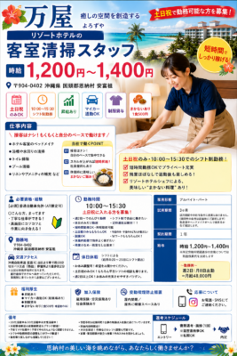 万屋では、沖縄・恩納村のリゾートホテルにて客室清掃スタッフ(契約社員・バイト)を募集しています。