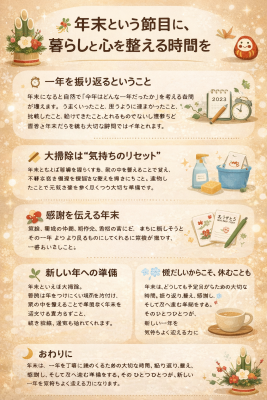 年末は、ただ忙しく過ぎていく時期ではなく、一年を丁寧に締めくくるための大切な時間です。振り返り、整え、感謝し、そして次へ進む準備をする。その一つひとつが、新しい一年を気持ちよく迎える力になります。