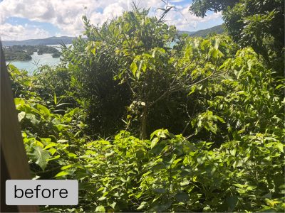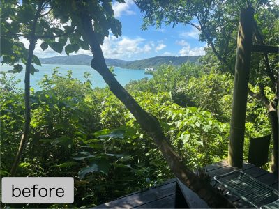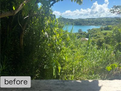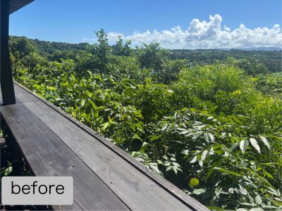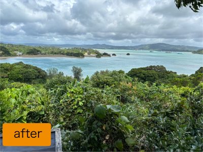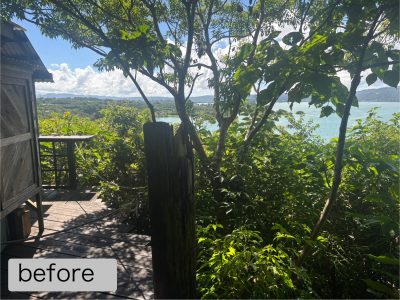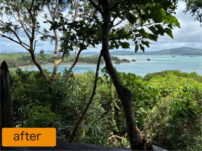 今回は、今帰仁の山の中にある素敵なカフェからご依頼をいただき、木々の伐採・枝払い作業を行いました。山あいに位置するこのカフェは、自然に囲まれた心地よい空間で、訪れるお客様がゆったりとした時間を過ごせる場所です。ところが、木々が成長するにつれて視界が遮られ、せっかくの海の景色が見えにくくなってしまったとのご相談を受けました。そこで今回の作業では、木をなるべく残しながら、高さを整えることで景観をより良くすることを目的としました。