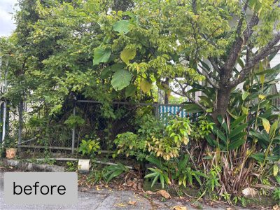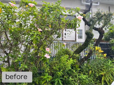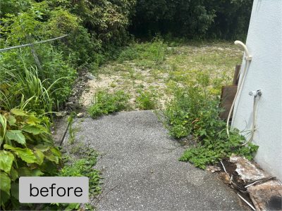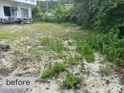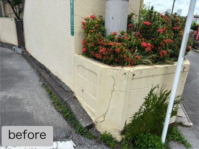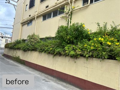 沖縄県名護市は自然豊かな環境に恵まれていますが、その分、雑草や害虫の管理には日々の対応が欠かせません。特に夏場は草の成長が著しく、さらに蜂の活動も活発になるため、敷地や駐車場の管理を怠ると利用者や社員にとって危険な状況となることもあります。今回は、名護市内の会社様からご依頼をいただき、敷地内の草刈りと外壁花壇に潜んでいた蜂の巣駆除を行いましたので、その様子をご紹介します。