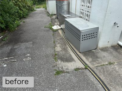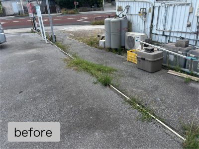 今回は、砂地とアスファルトの2種類の地面が混在する敷地での草刈り作業を行いました。