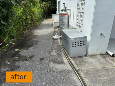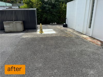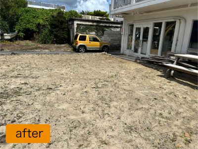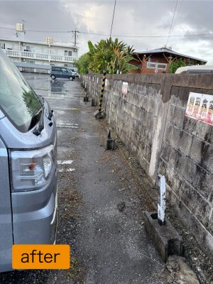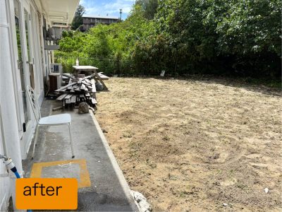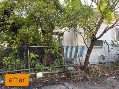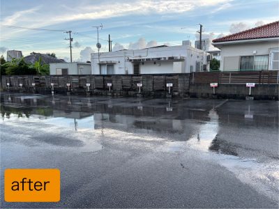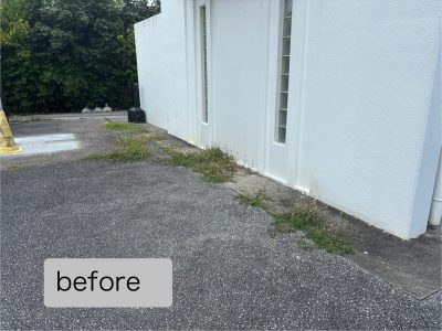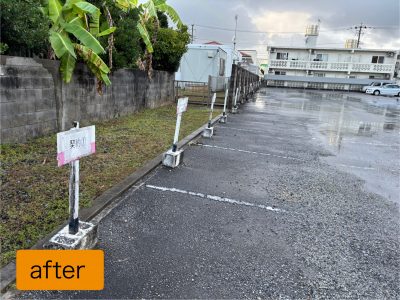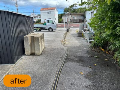 全体の作業を終えた後、敷地全体が見違えるようにスッキリしました。特に砂地部分は、雑草を削り取ることで広々とした印象に変わり、アスファルト部分は隙間の雑草がなくなることで清潔感が増しました。