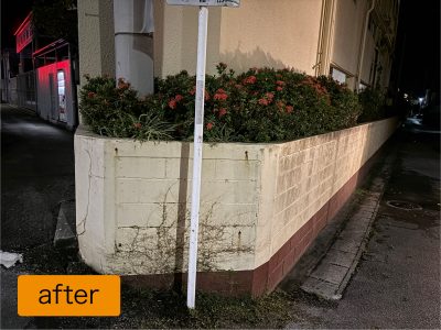 名護市での会社敷地・駐車場・花壇の管理において、草刈りや蜂の巣駆除は欠かせない作業です。今回のご依頼でも、敷地全体の草をすっきり整えることで見栄えが大きく改善し、さらに花壇に潜んでいたアシナガバチの巣を7個撤去したことで、安心できる環境を取り戻すことができました。