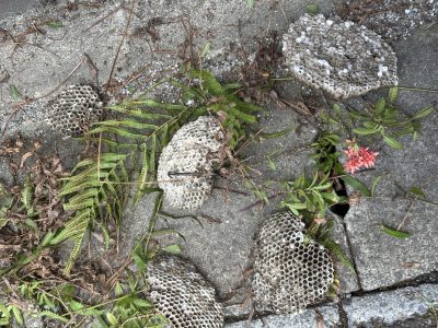 今回のように草刈り作業を進める中で蜂の巣が見つかるケースは少なくありません。雑草や植木が茂っていると、巣の存在に気付きにくく、気づいたときには複数の巣ができていることもあります。