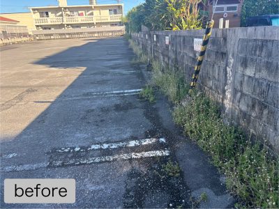 今回のご依頼では、会社の敷地全体と駐車場、さらに外壁沿いに設けられた花壇周りの草刈りを行いました。夏の名護市は日差しが強く、わずか数週間で雑草が一面を覆い、駐車場のアスファルトの隙間や花壇の縁にも草が伸びてしまいます。