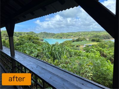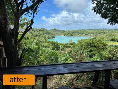 枝を落とした後は、実際にカフェの席から眺めを確認。オーナー様にも立ち会っていただき、海の見え方が改善されているかをチェックしました。不要な枝が減ったことで、緑の奥には海が顔を出し、自然と一体になった美しい景観が広がるようになりました。